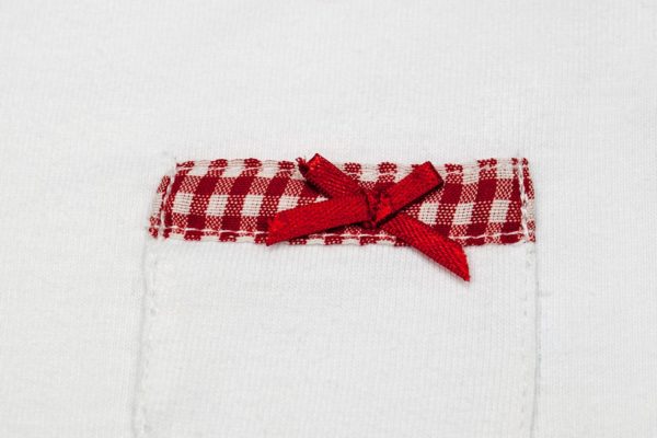 Das weiße Kinder-Shirt ist mit dem roten Print „Große Schwester“ versehen. Am Halsbündchen wurde eine weiße Zierborte mit eingearbeitet. Eine kleine Tasche mit Besatz aus Karo-Vichy und ein rotes Zierschleifchen runden das niedliche Design ab. Das T-Shirt besteht zu 100% aus Baumwolle und lässt sich bequem bei 60 Grad waschen.
